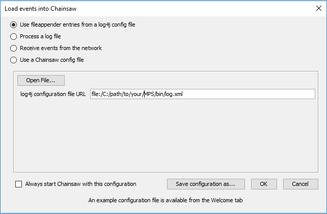 How to configure Chainsaw? Let’s make a choice here: we are going to connect Chainsaw to the MPS log via the file system, not via sockets. Sure, the log4j architecture offers a socket based approach, but that is much more involved. It would require configuration changes at the MPS side of things, whereas using the log file only requires a proper configuration at the Chainsaw side. Moreover, changing the configuration at the MPS side has the difficulty that the log4j version that MPS uses is way beyond end-of-life, making it difficult to find the proper components and documentation. MPS still uses log4j version 1.2.17 released Jan 2013 and log4j version 1 was declared end of life in 2015. I briefly tried to get the sockets running anyway but I did not succeed. Maybe at a later time.