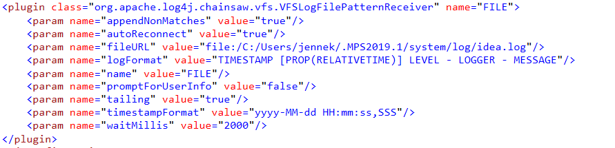 Open mps.xml in your favorite editor and there you have it: Chainsaw has written the receivers (plugin) for the senders (appenders) in log.xml. The plugin we need is the one with $LOG_DIR$/idea.log in the element with name fileURL. See below.